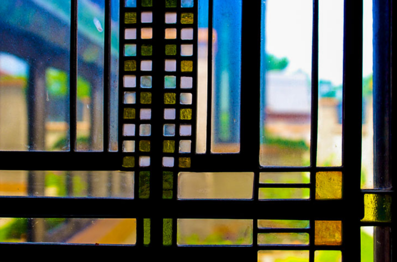 装飾の施されたガラスや、木製の照明カバーなどの造りが