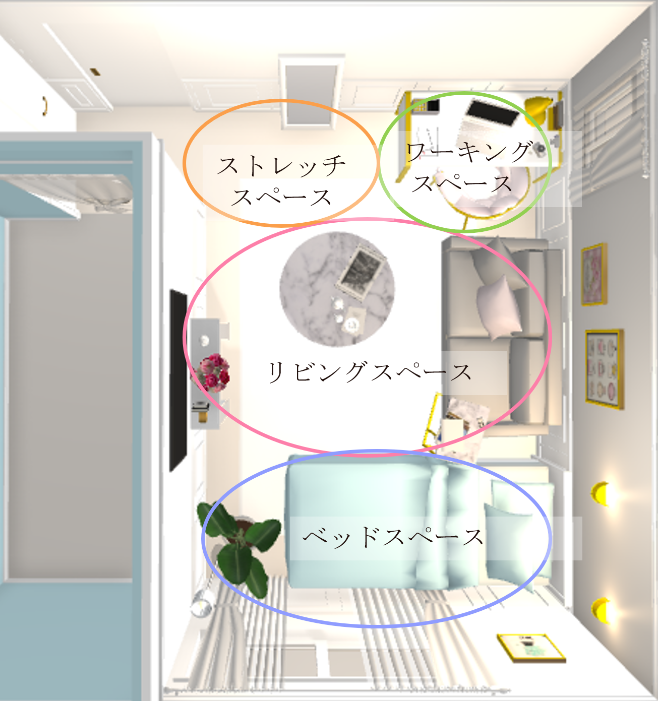 家具の配置を工夫することで、ストレッチ用スペースを確保する。